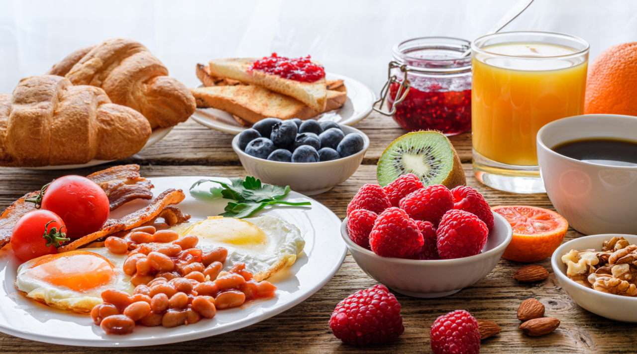 Smoked ham, omelets, beef sausages, potato, gouda cheese, mini pancakes, dessert, salad