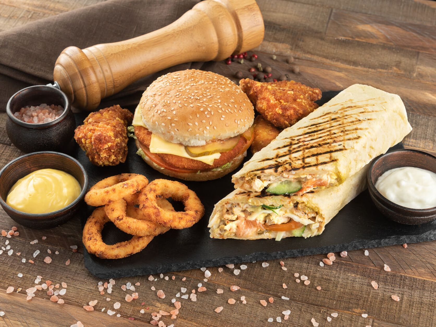 Pui crispy, frunze de salată, castraveți proaspeți, roșii, sos