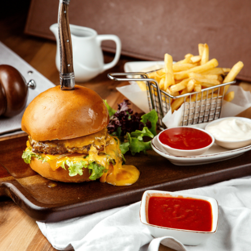 100% govedja pljeskavica, chedar sir, karmelizovani luk, dimljeni sos, kisjeli krastavci, pomfrit