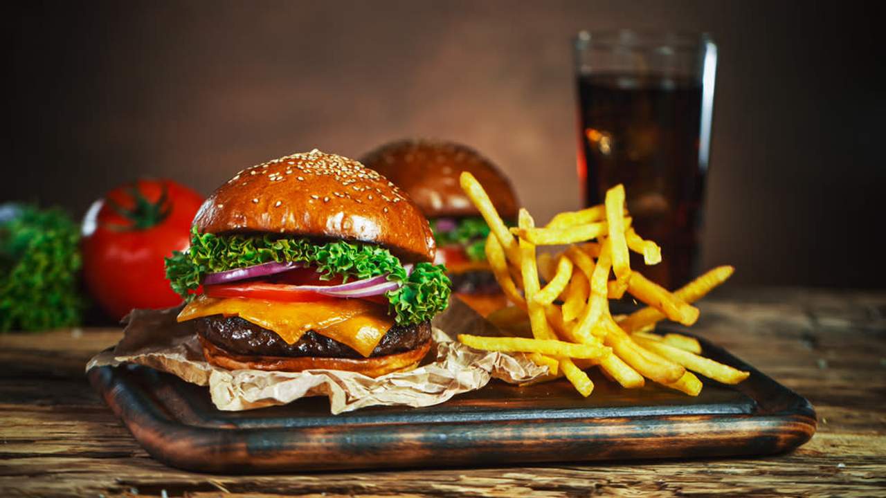 meso, gauda, athos sos, kiseli crveni luk, kiseli krastavci, paradajz, zelena salata, pomfrit