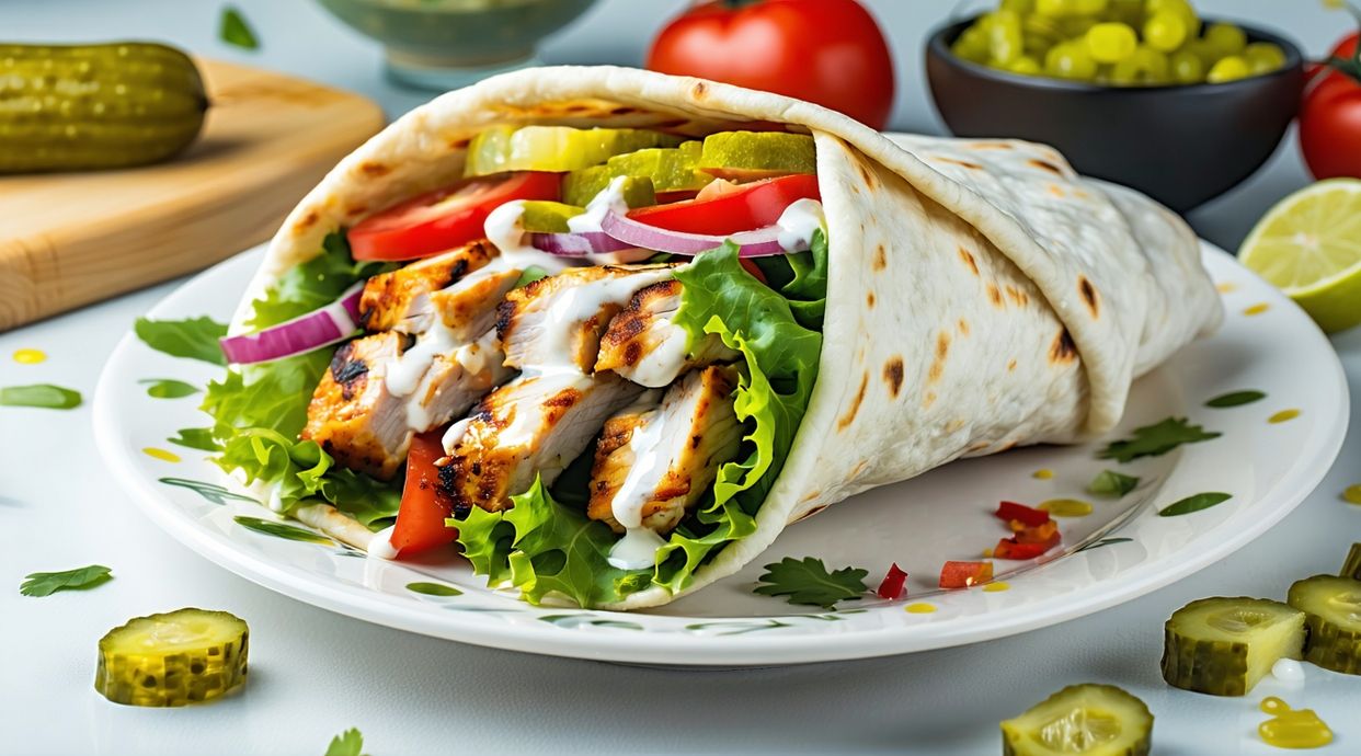 Tasty chicken shawarma.Available in Plain (no sausage), single sausage and double.