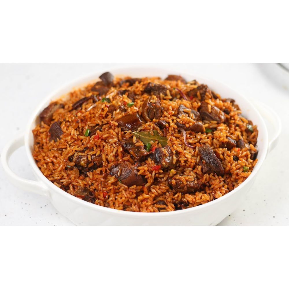 Our Signature smokey Jollof served with chicken piece & fried plantain