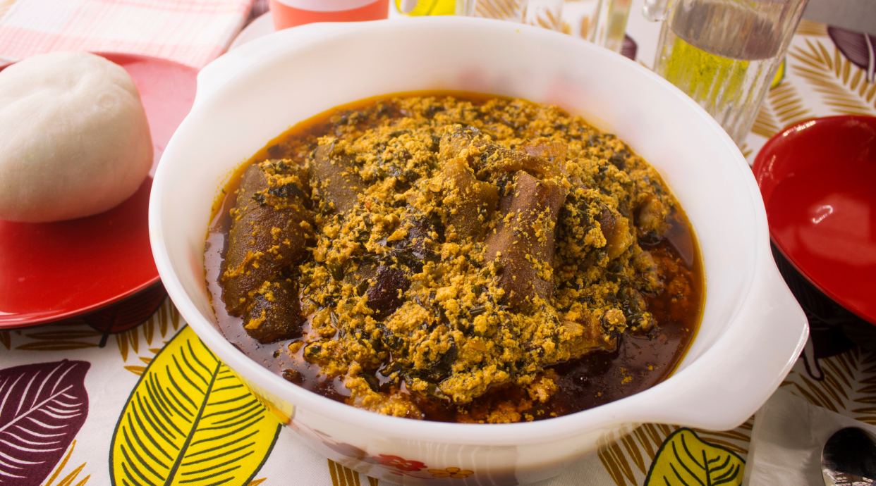A rich and flavorful soup made with ground melon seeds, vegetables, stockfish and dry fish