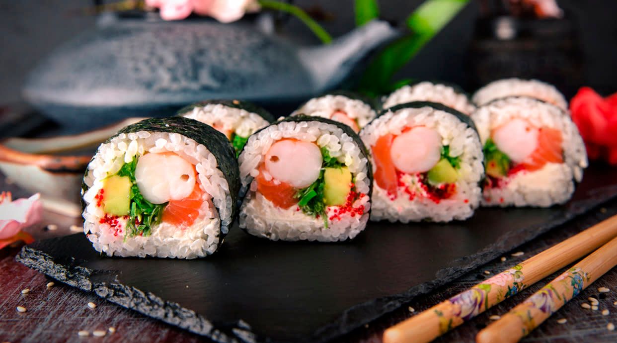 Hosomaki z kanpyo x8.Futomaki z: krewetką w tempurze x12, łososiem x6, warzywami w tempurze (sos słodki, migdały) x6.Geisha Roll x8.