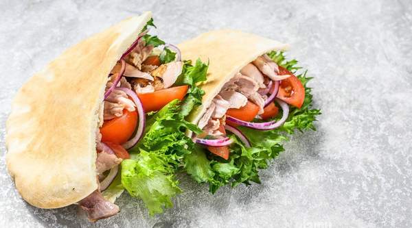Mięso, sałata lodowa, oliwa z oliwek, ser feta, ogórek i pomidor