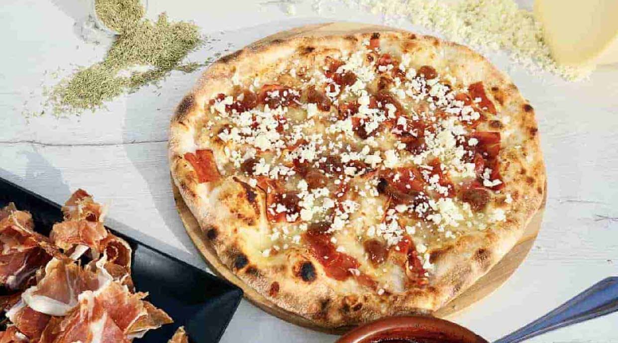 Sos z pomidorów, mozzarella, oregano, szynka parmeńska, świeże pomidory i rukola
