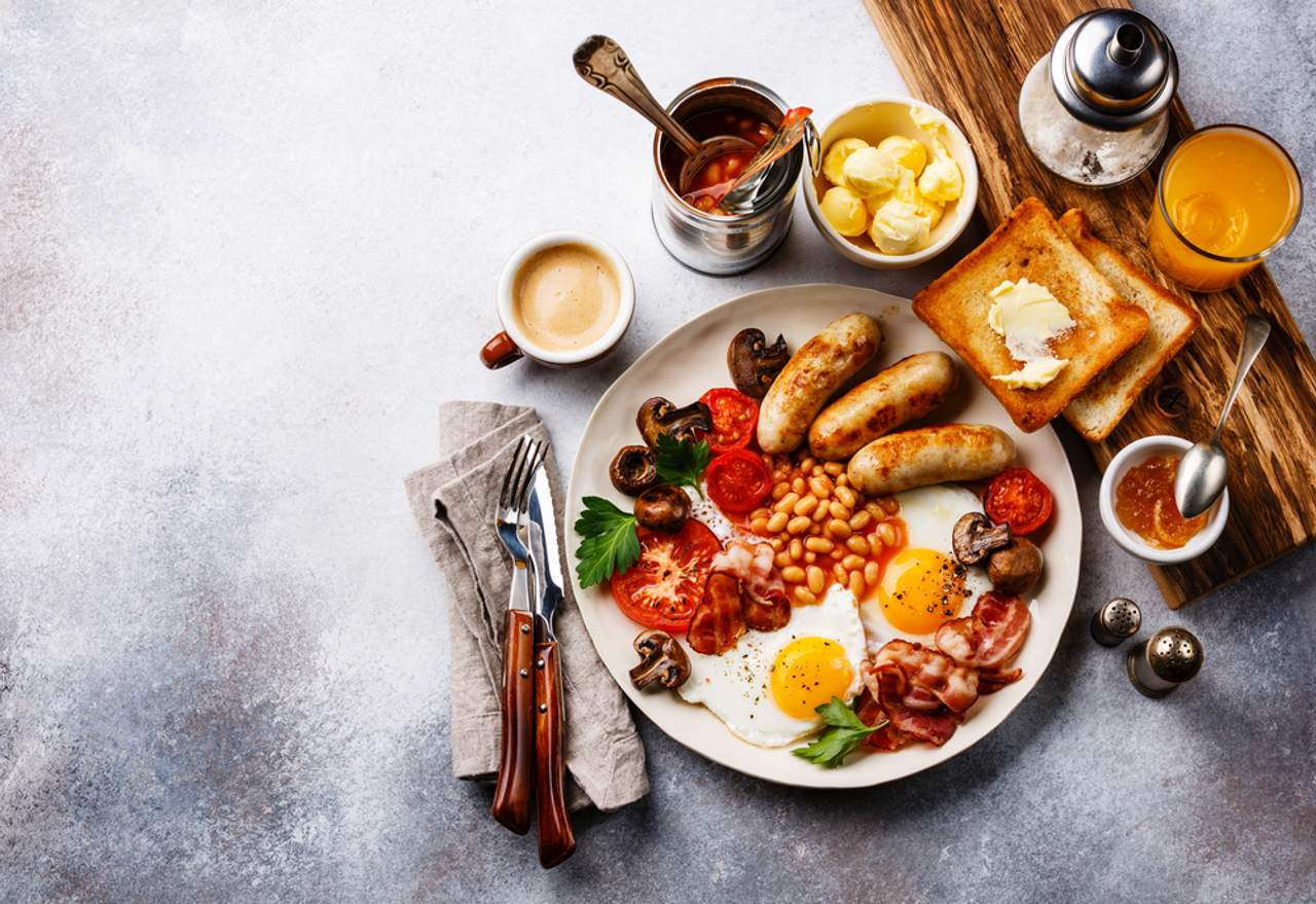 Franfurterki 2szt., boczek, jajko sadzone, pieczarki, pomidor z grilla, grzanki z bagietki, placek ziemniaczany z kwaśną śmietaną i szczypiorem, fasolka w pomidorach