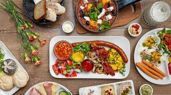 2 jajka sadzone/ jajecznica z 3 jaj, ser żółty, twarożek na słono, szynka, pomidor, ogórek świeży, ketchup, pieczywo, masełko