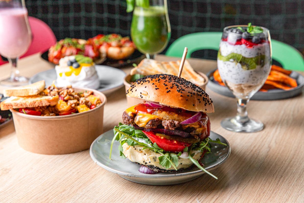 Wołowina, ser cheddar, cebula, ananas, burak, pomidor, ogórek, rukola