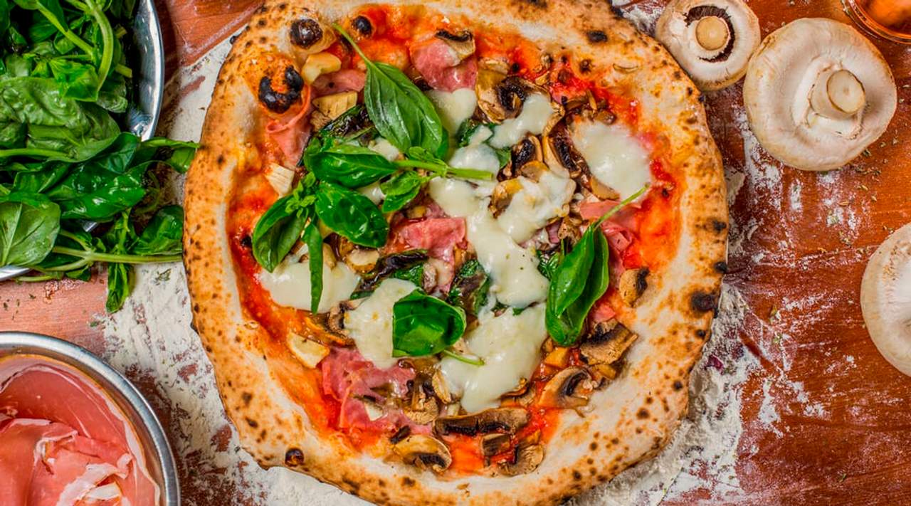 Sos, ser mozzarella, szynka prosciutto, pomidor, rukola, oregano