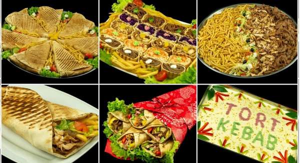 Mięso z kurczaka, baranina lub mieszane z sałatą, kapustą , pomidorem, ogórkiem, cebulą, frytkami i sosami do wyboru