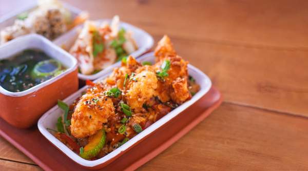 Z ryżem, surówką i sosem słodko-kwaśnym