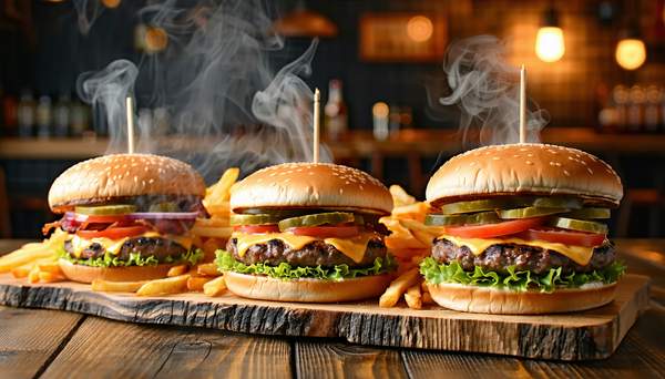 Kotlet wołowy, ser cheddar, papryka jalopeño, cebula czerwona, ogórek konserwowy, sałata lodowa , majonez, frytki, sos sambal