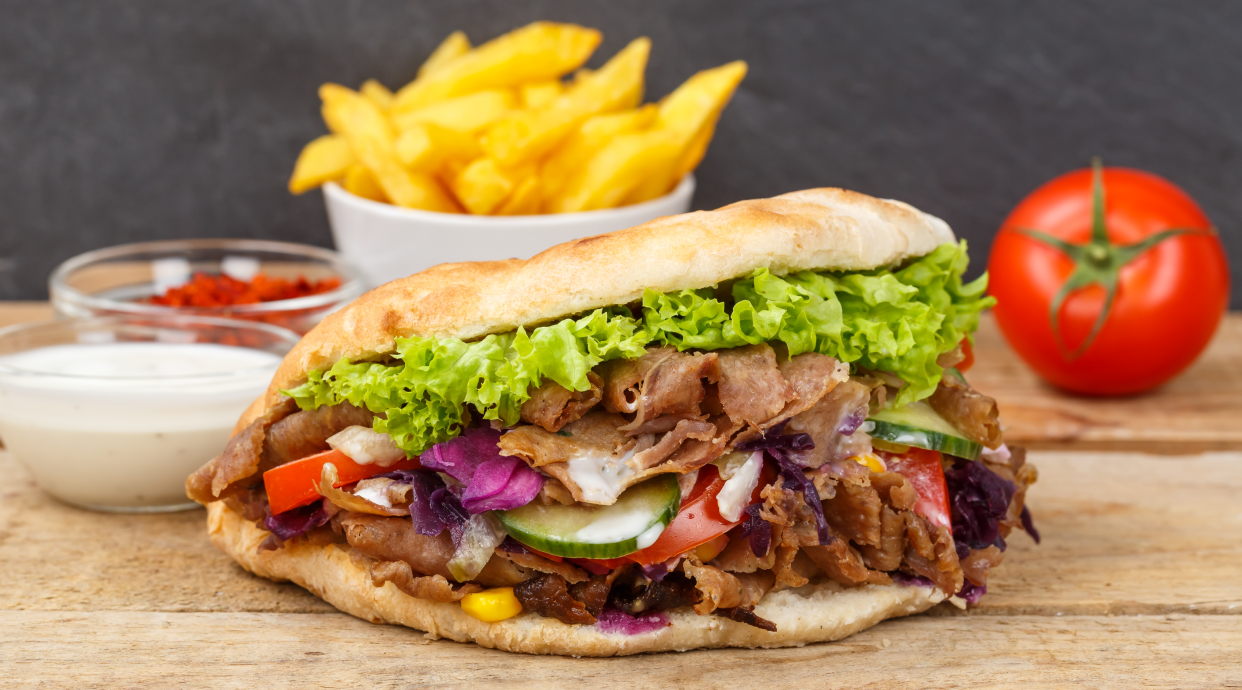 Mięso, frytki i sos w jednej picie – brzmi dobrze? Smakuje jeszcze lepiej! Solidna porcja energii na każdą porę dnia. Skład: pita, mięso, frytki, sos, kapusta pekińska, surówka z białej kapusty, ogórek, pomidor