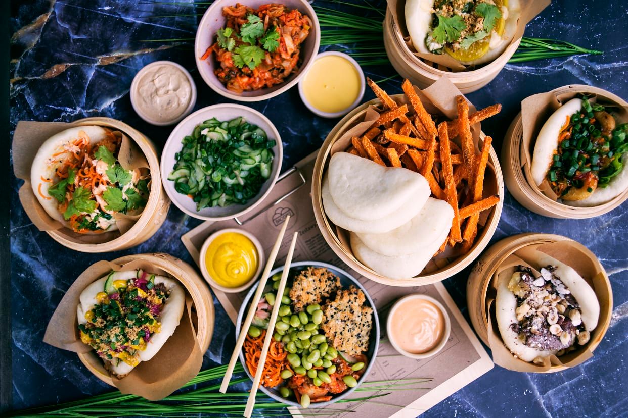 boczniaki w panko, tofu w tempuze, frytki, edamame z wędzoną solą, marchew w sezamie, marynowana czerwona kapusta, sosy (wegański limonka mayo, sweet chilli) , 2 bułeczki bao frytki do wyboru: belgijskie lub z batatów.