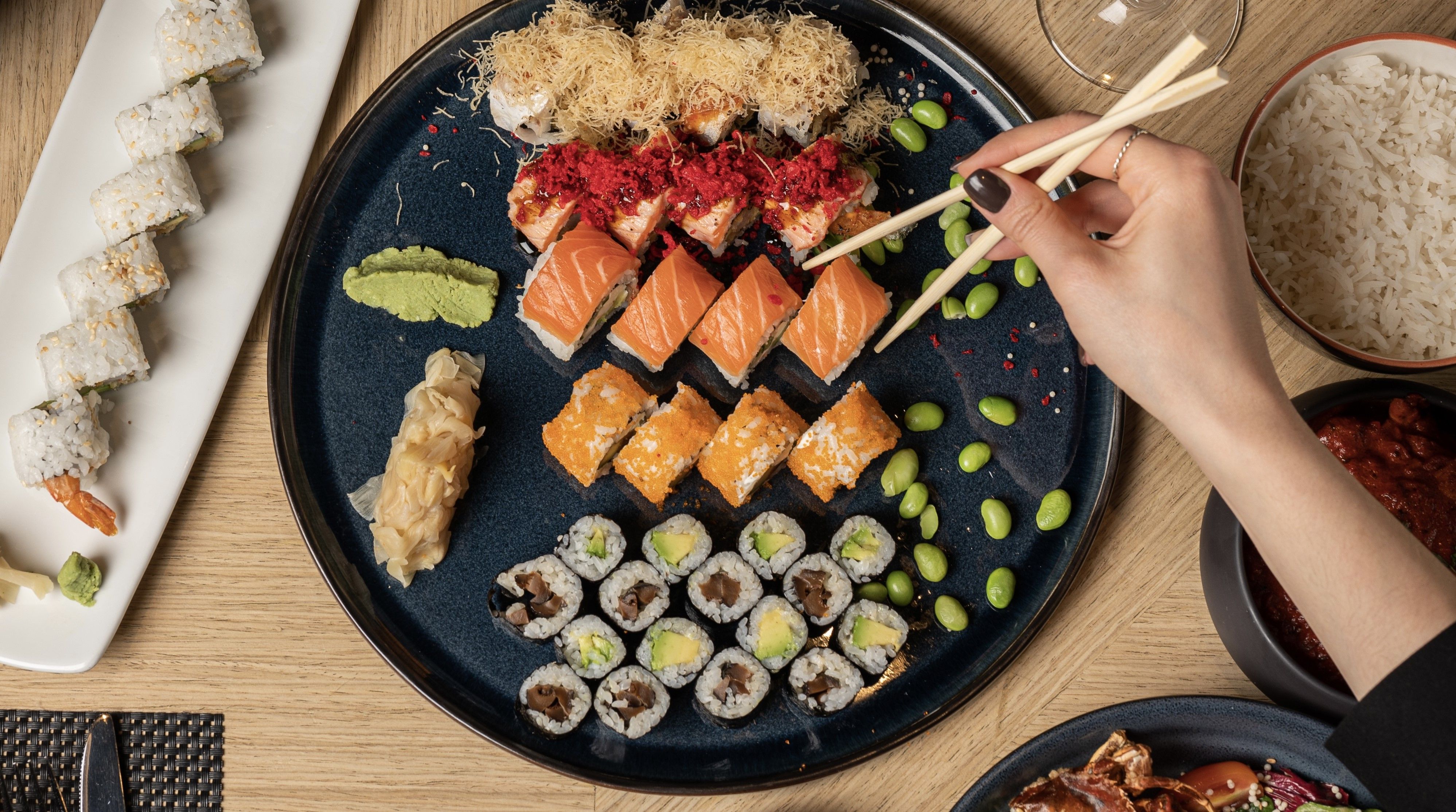 Tuńczyk, hamachi, łosoś, okoń morski, krewetki tygrysie, kolendra