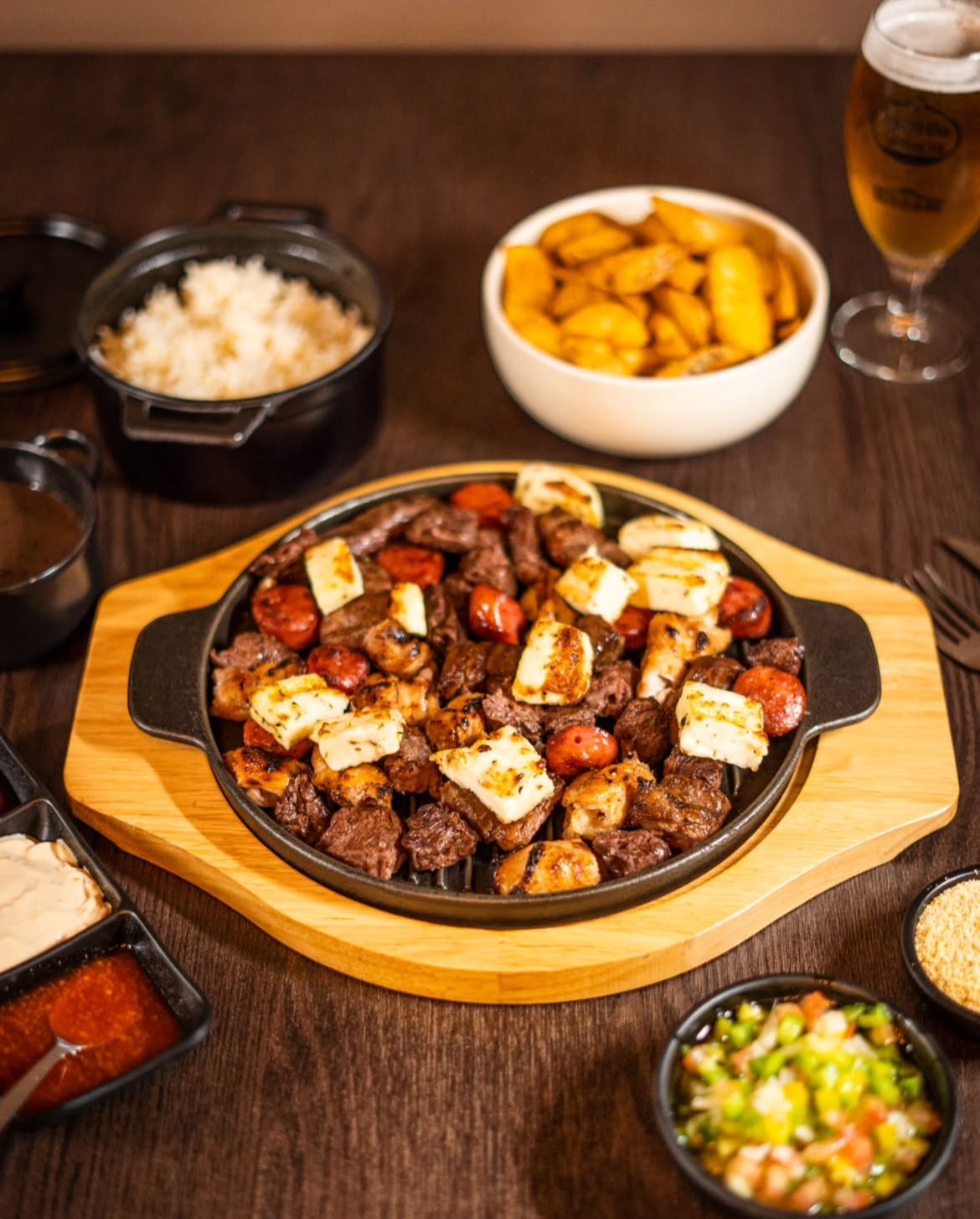 Inclui 3 espetos de alcatra, 2 espetos de salsicha e 2 espetos de frango. Todos fora do palito e com uma camada de queijo gratinado tipo catupiry. Inclui 3 acompanhamentos à escolha. Recomendado para 2 pessoas