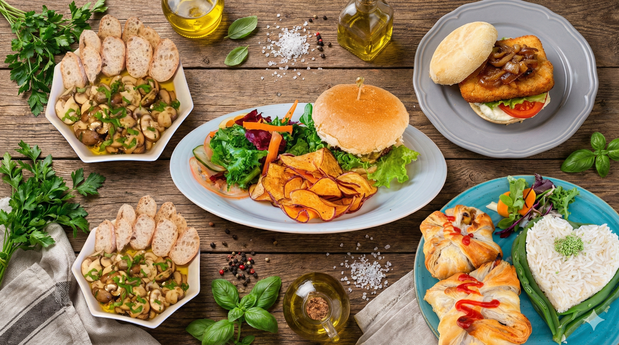 Burger "Meaty" em pão especial, maionese caseira vegan, curgete em vinagreta, alface, tomate e queijo vegan, com chips de batata-doce e salada.