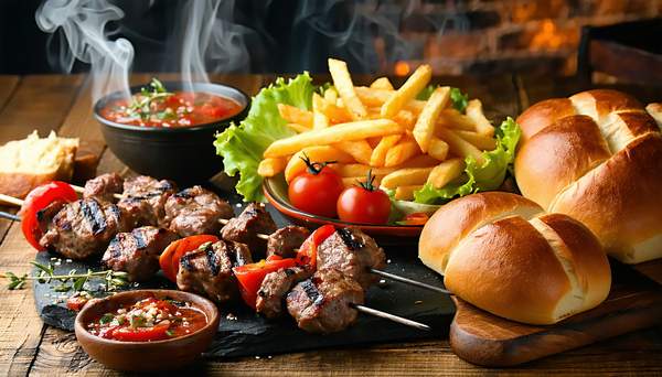 Carne de kebab/alface/cebola frita/cenoura/milho/tomate/batata palha/cogumelos/molhos a discrição