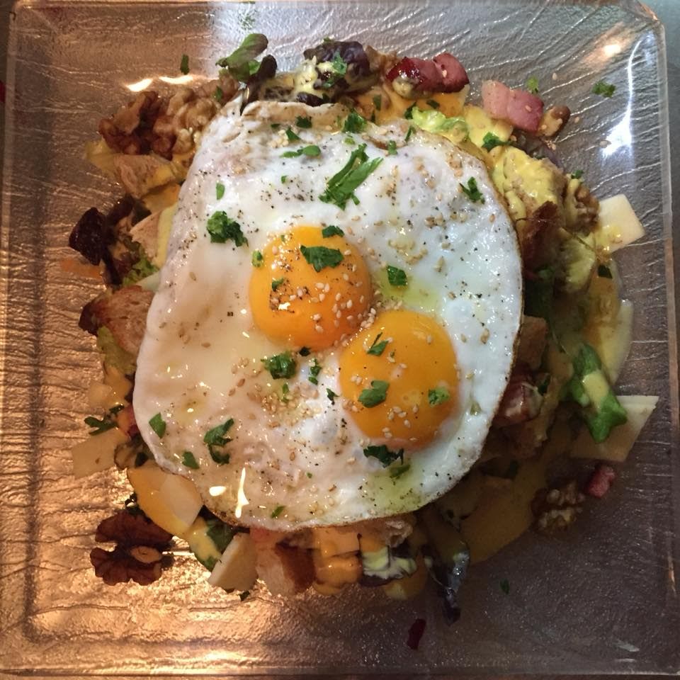 Com ovo, fiambre, natas e queijo.