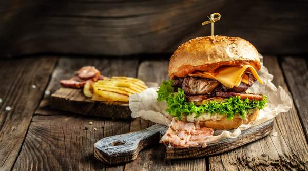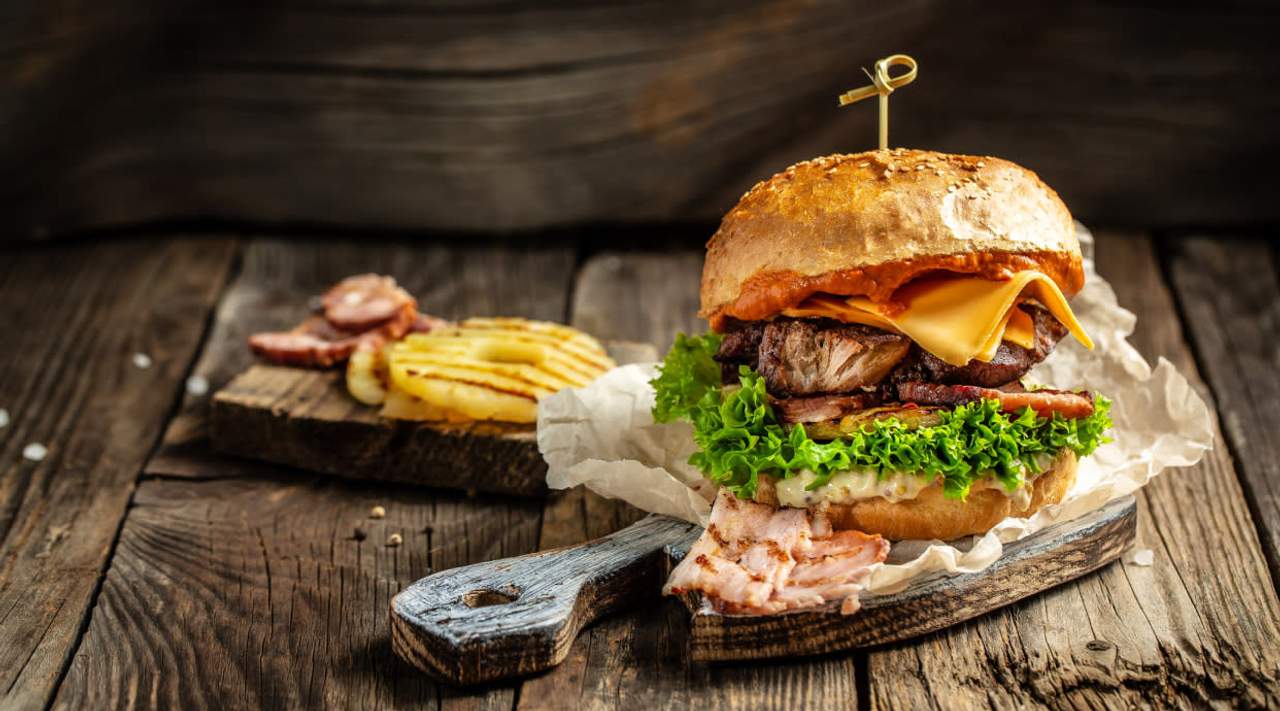 2x 160g hamburgueres, alface, tomate, queijo cheddar, picles de pepino, cebola roxa & fries