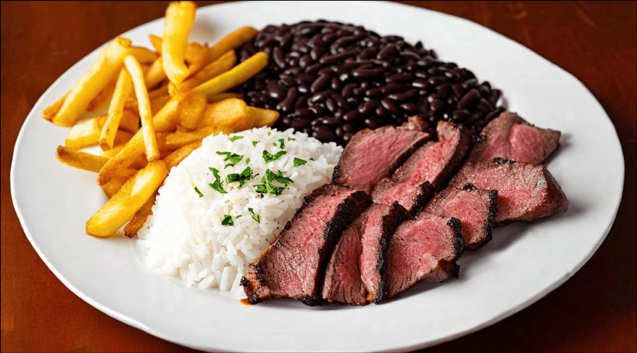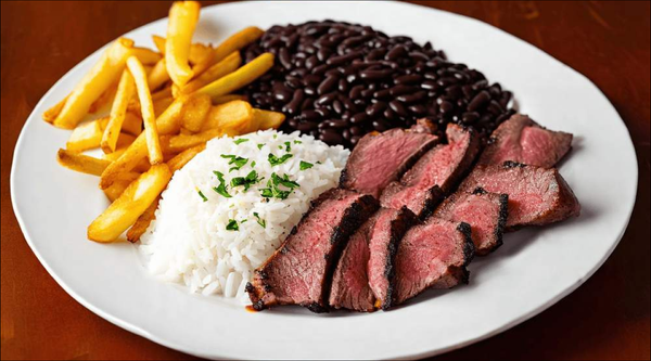 Arroz, Feijão Preto, Batata Frita, Fatias de Picanha