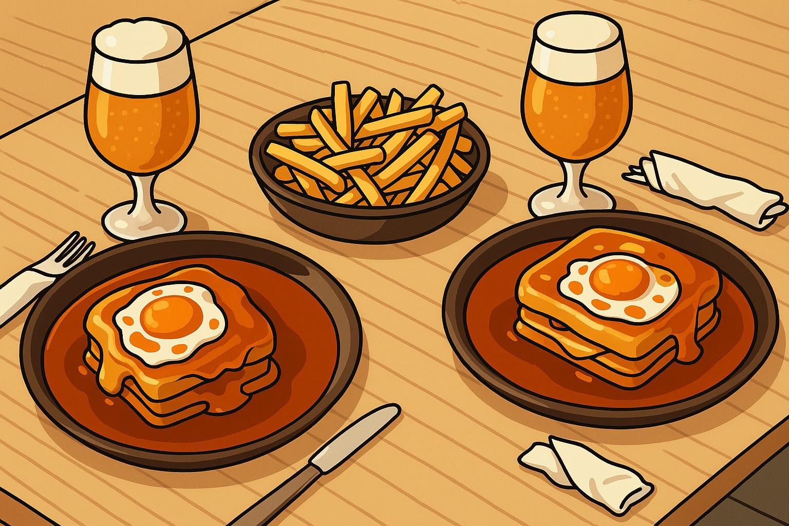 Pão de forma, queijo, fiambre, bife, ovo e molho de francesinha.