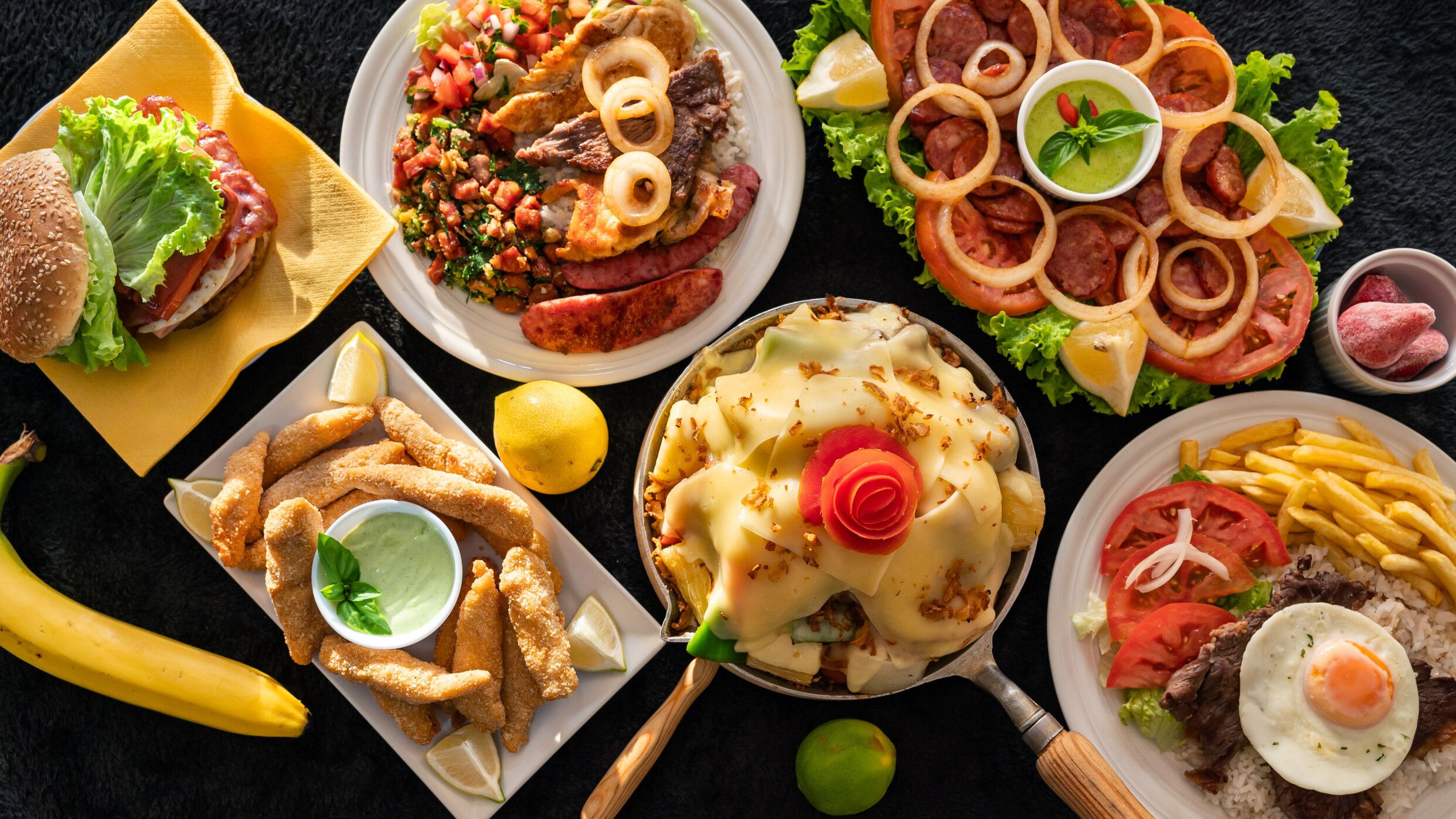 Salsicha brasileira,peito de frango,arroz,feijão,batata frita e salada