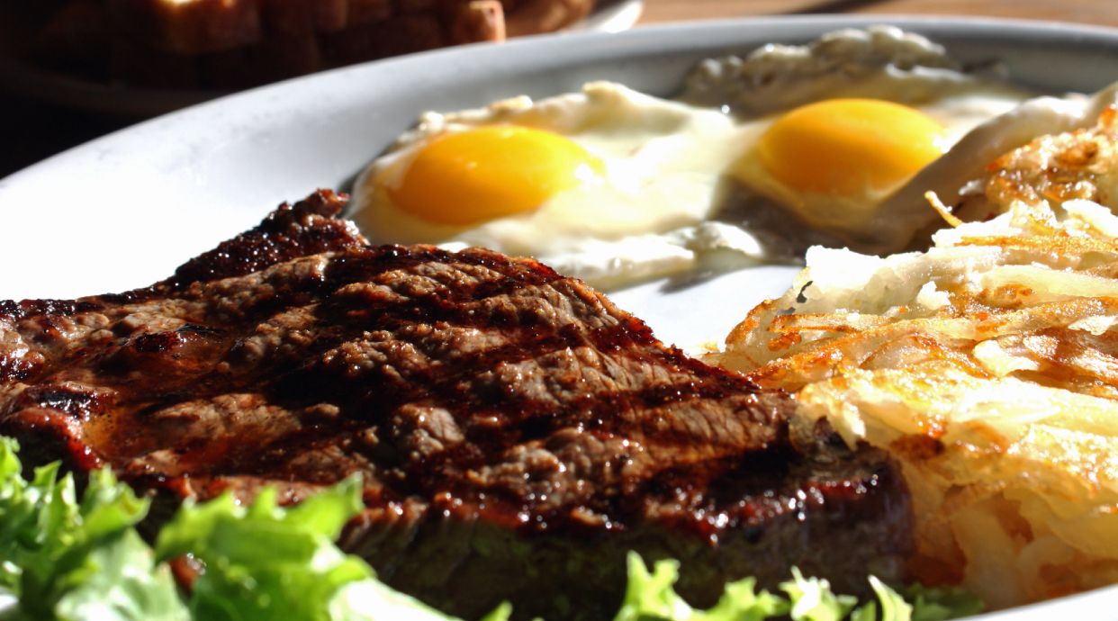 Bife da Vazia, Ovo Estrelado, Arroz Branco, Batata Frita e Salada (Alface, Tomate e Cebola)