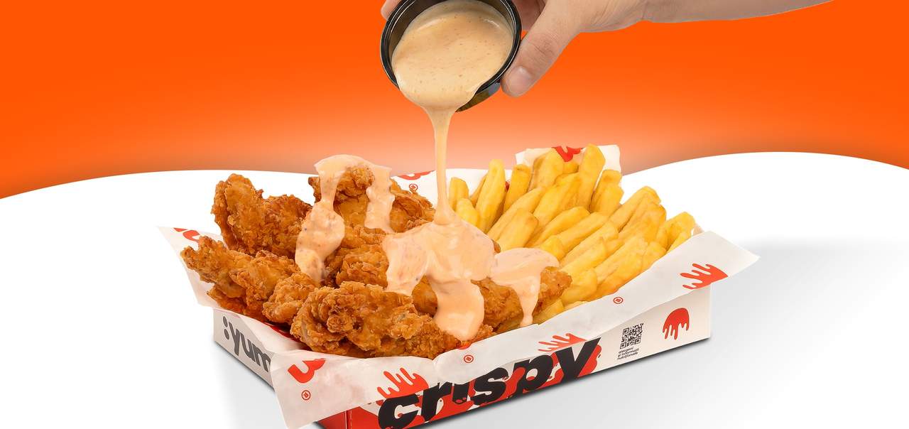 2 crispy (120gr), cartofi (150gr), sos cât ai nevoie*.