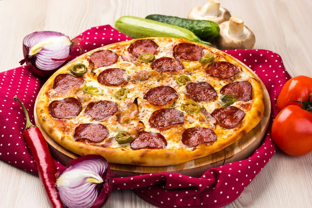 Sos de rosii, mozzarella, sunca, salam, ciuperci, masline, ardei gras - 500g