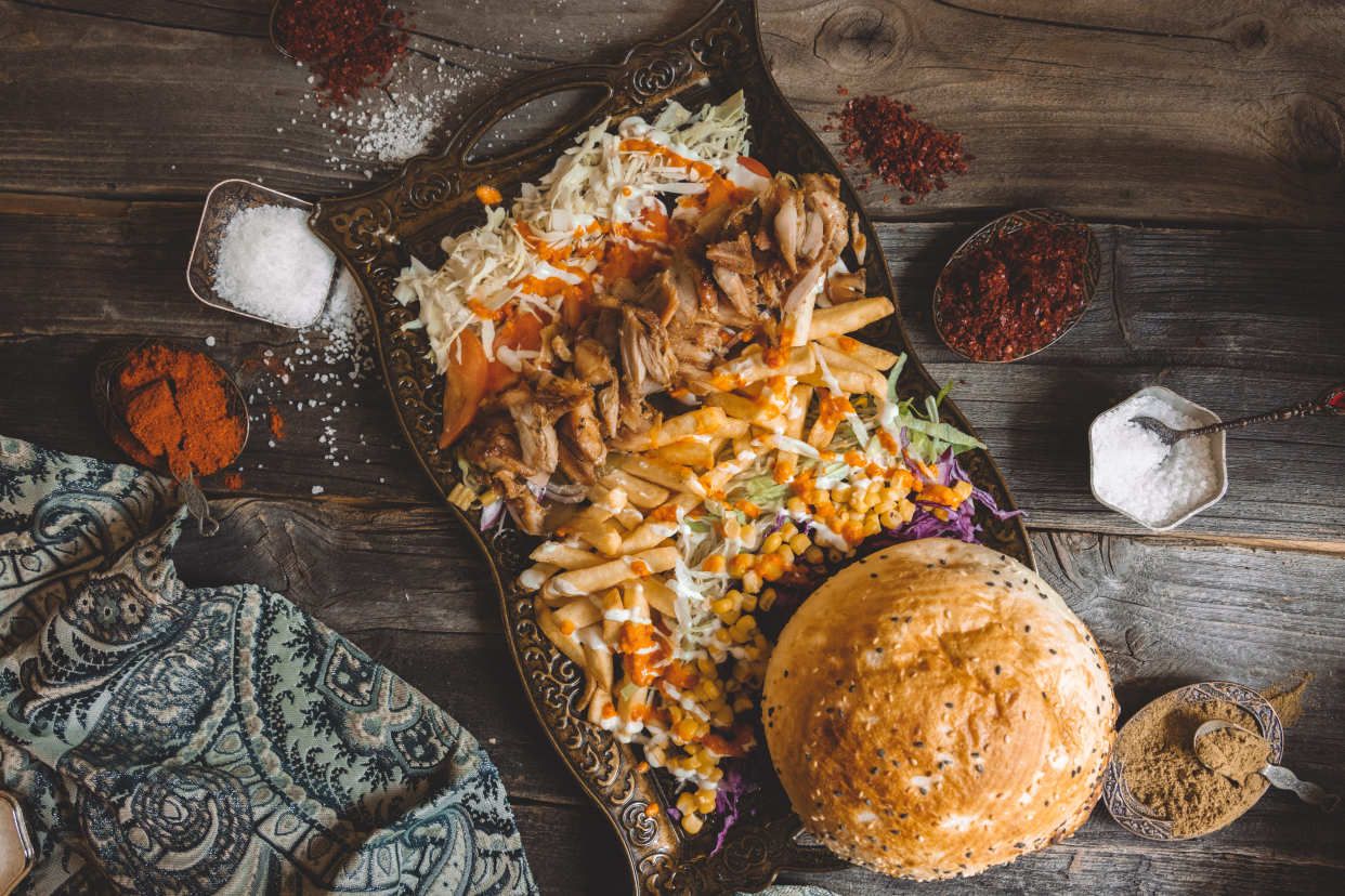 Carne de vita angus, cartofi prajiti, salata iceberg, varza alba, rosii, ceapa, castraveti murati, sos usturoi, sos picant, tzatziki, chifa/lipie - 600g