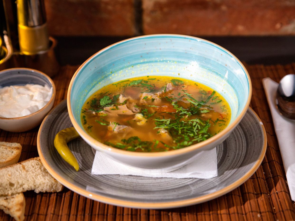 Carne pui, ceapă, morcovi, țelină, ardei gras, capia, orez, ouă, smântână, iaurt - 350ml