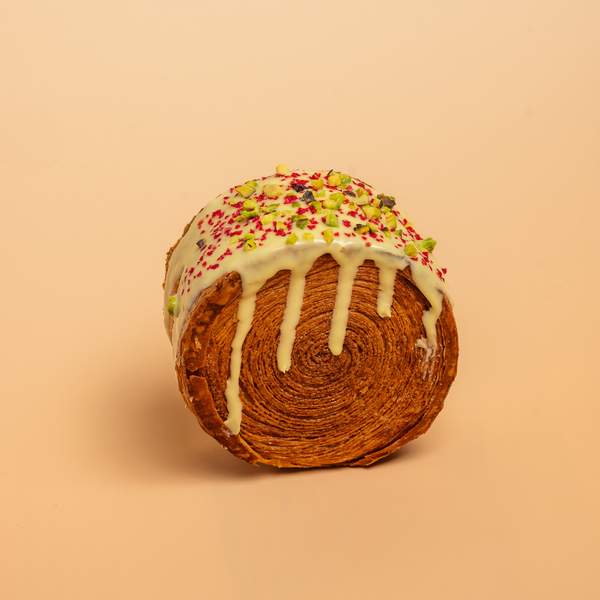 Croissant, cremă de fistic (lapte, ouă, stevia, amidon de porumb, unt, pastă pură de fistic, frişcă lichidă), ciocolată albă fără zahăr, fistic - 160g