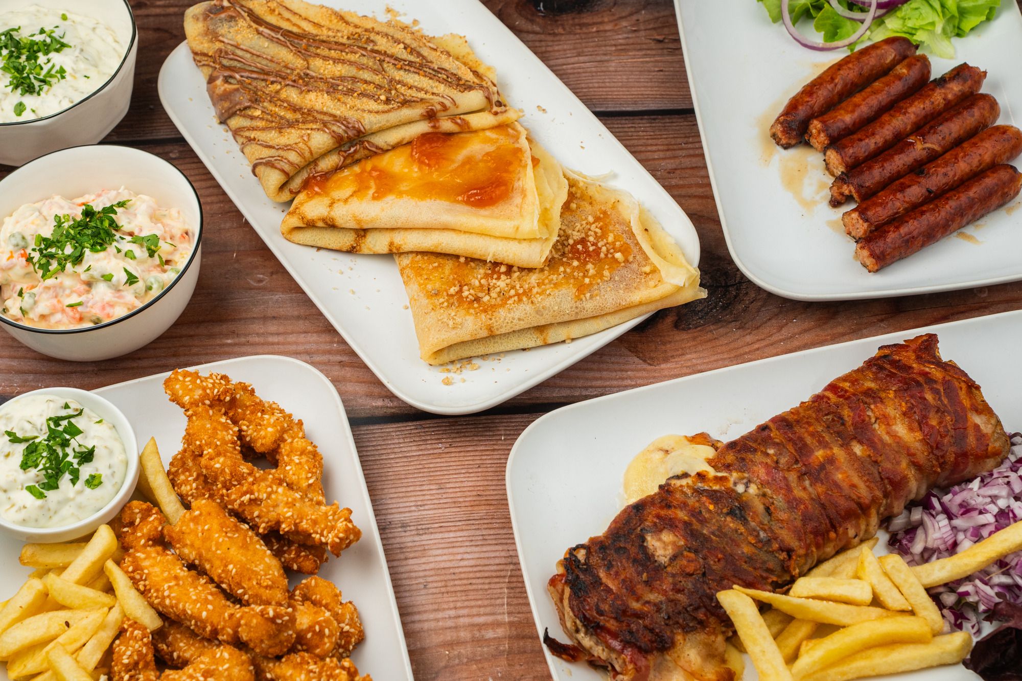 Panirani pileći file 250grama, pomfrit, limun, tartar sos + palačinka eurokrem i plazma