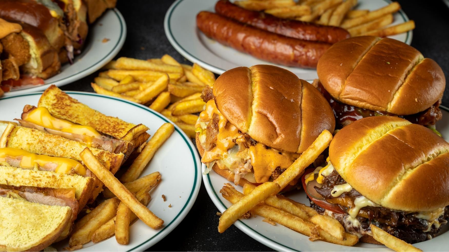 Zemička od krompira, 100g dry-aged juneće meso, 150g dry-aged praseća bajadera, provolone sir, chipotle sos, iceberg, hrskavi luk, paradajz, kiseli krastavčići, pomfrit