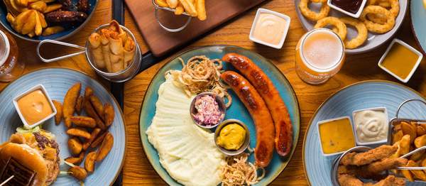 Kobasice po izboru, bratwurst, pivska kobasica, kobasica sa kozjim sirom, domaća ljuta kobasica, začinjene kriške krompira, onion rings, coleslaw, tost, krilca, chicken fingers, taquitosi, pomfrit. Sosevi: sriracha, majonez, beli luk, senf-med, nacho