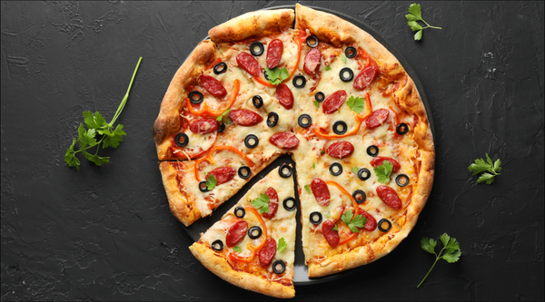 Sauce tomate, mozzarella, viande hachée, pepperoni, piment, olives
