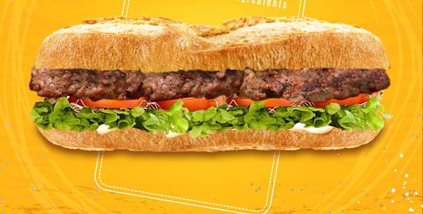 Buns Géant, Steak Haché, Bacon de Boeuf, Fromage, Oignon Caramélisé, Laitue, Tomate, Mayonnaise, Sauce BBQ, Ketchup.