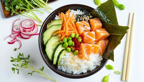 Saumon (80 g) ananas, avocat, choux rouge, radis, edamame, sésame wasabi, sésame blanc