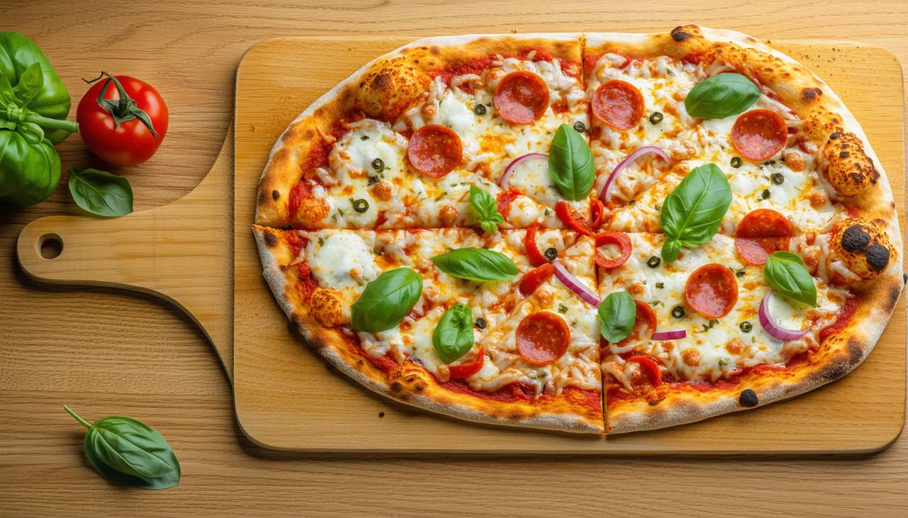 Sauce tomate, mozzarella, pepperoni, tomate cerise, basilic, olive