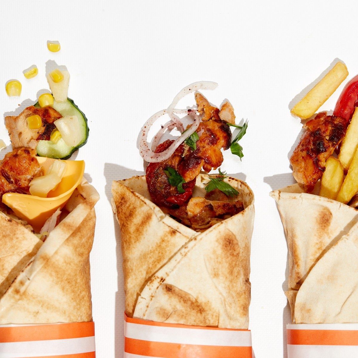 Лаваш-піта, курка на вертелі, яловичина на вертелі, соус фірмовий часниковий, картопля фрі, томат, перець цицак, цибуля маринована, петрушка