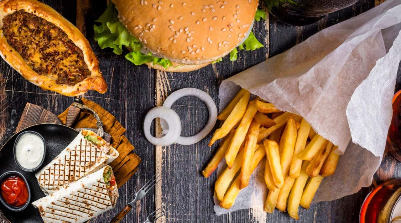 Բուրգերի հաց, Խոզի միս,Սոխ,Լոլիկ, Վարունգ,Ֆրի,Սոուսներ
