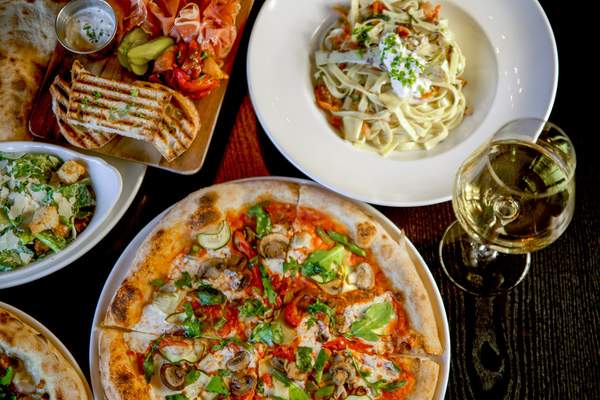 Pelat, mozzarella, šampinjoni, grilano povrće, rikola, kukuruz, masline, origano
