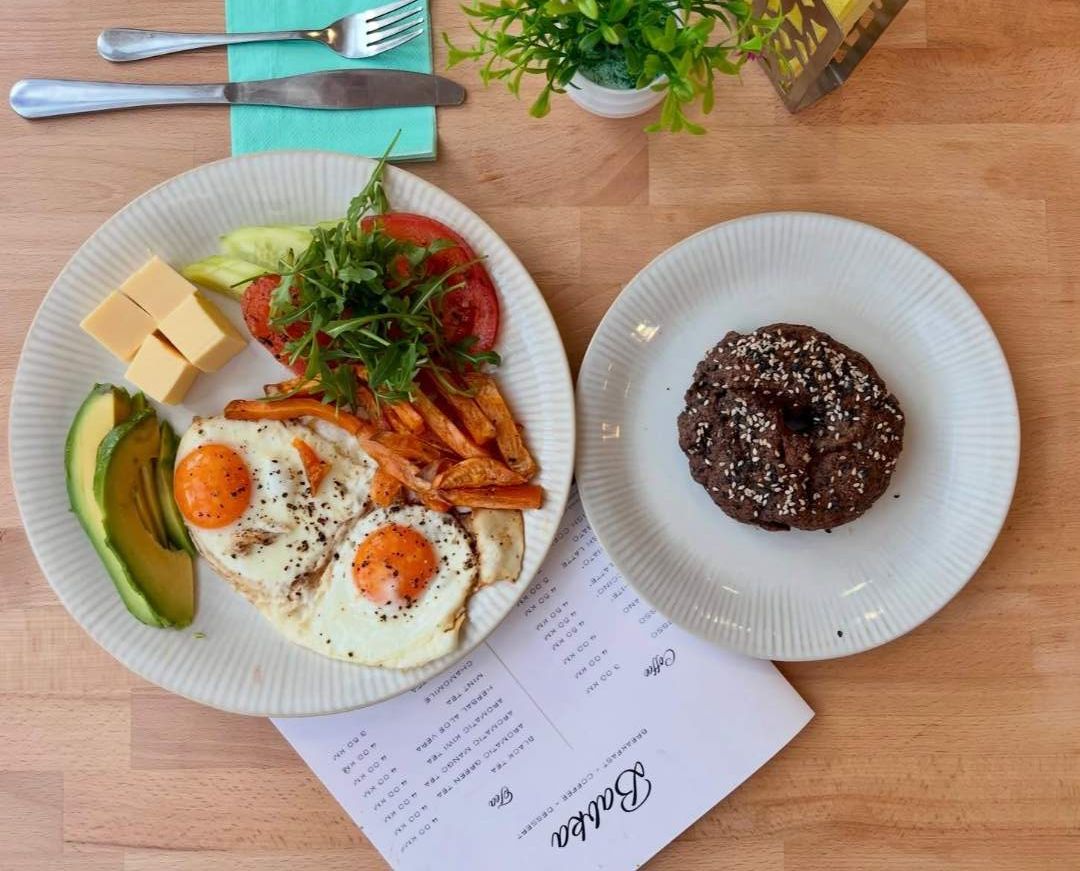 Pržena jaja, avokado, pavlaka, kopar, paradajz, krastavac, mozzarella ili feta sir, masline, pečeni batat, hljeb.