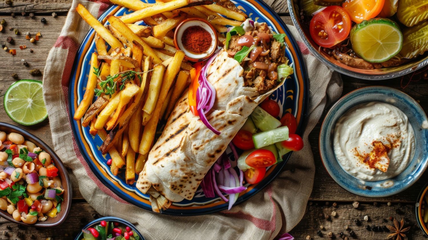 Juneće kebab ćufte wrap (juneće meso, salata, bijeli sos, ljuti sos), čorba od leće, pomfrit, ajran, voda, hurma