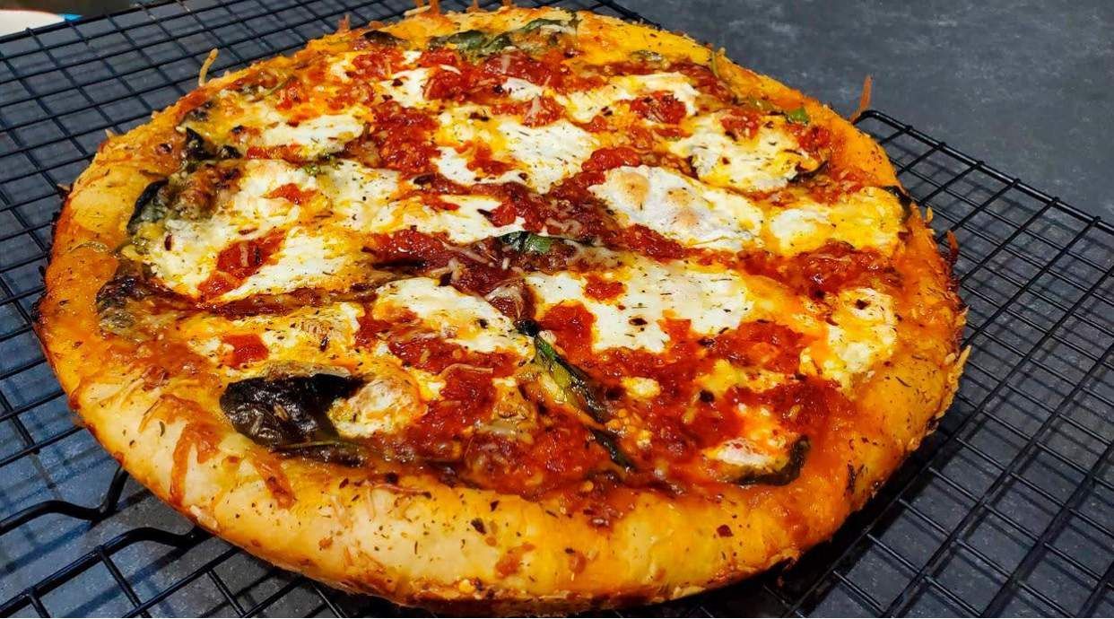 Доматено пюре, кашкавал, шунка, гъби, маслини, подправки