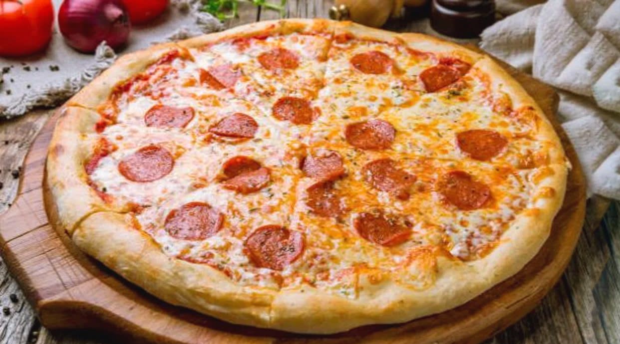 Tomate, mozzarella, jamón york, champiñones, aceitunas y orégano