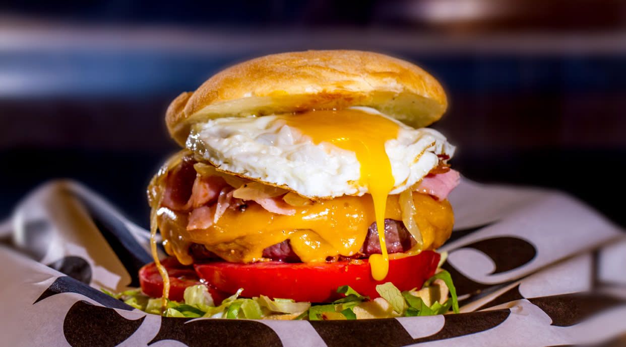 Con huevo frito, bacon, queso cheddar, lechuga, tomate, cebolla asada y mayonesa