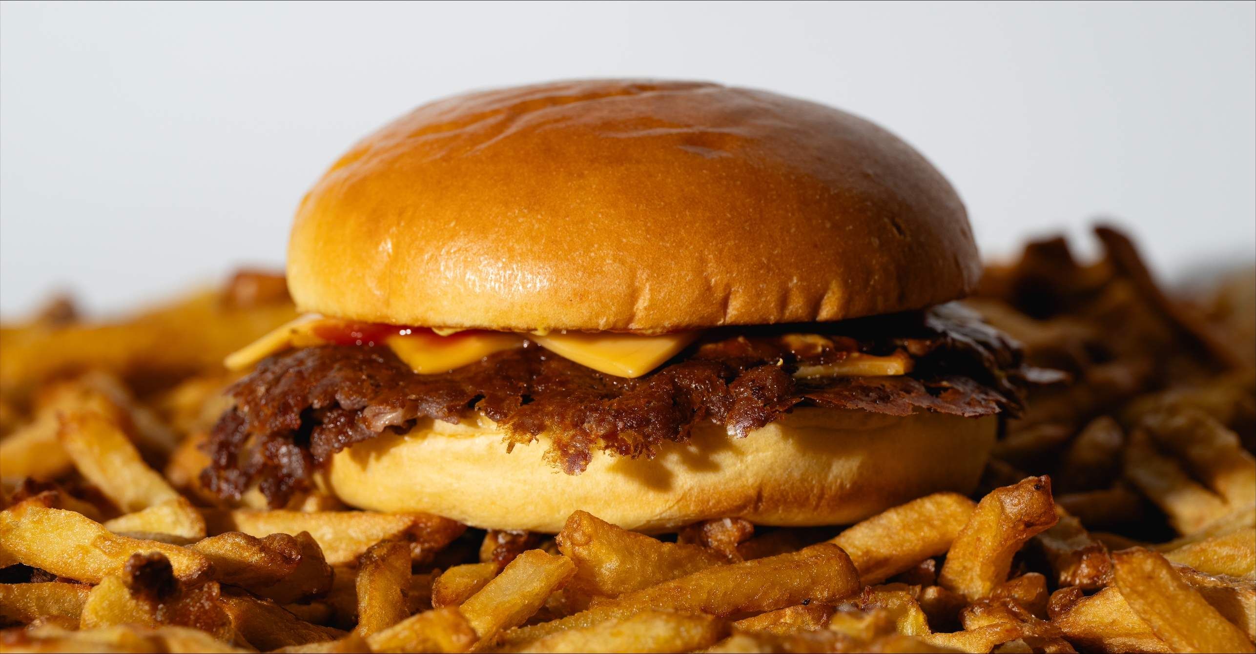Una ultra smash burger, queso cheddar fundido, cebolla, ketchup, mostaza y nuestro esponjoso pan brioche.